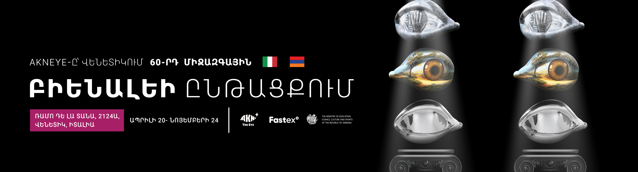 Curated by Anastasia Dawson, Phygital Spaces features an immersive digital space that invites the audience to explore the ever-growing collection of digital representations of the AKNEYE sculptures on LED screens, enhanced with hover technology for an engaging learning experience. Moreover, AKNEYE's motion stand displays will showcase eye sculptures as dynamic works of art, symbolising the fusion of conventional art methodologies and contemporary technological advancements. Throughout the Biennale, visitors will have the opportunity to observe Armenian and international artists produce unique pieces of art on-site, which will be subsequently transformed into NFTs.